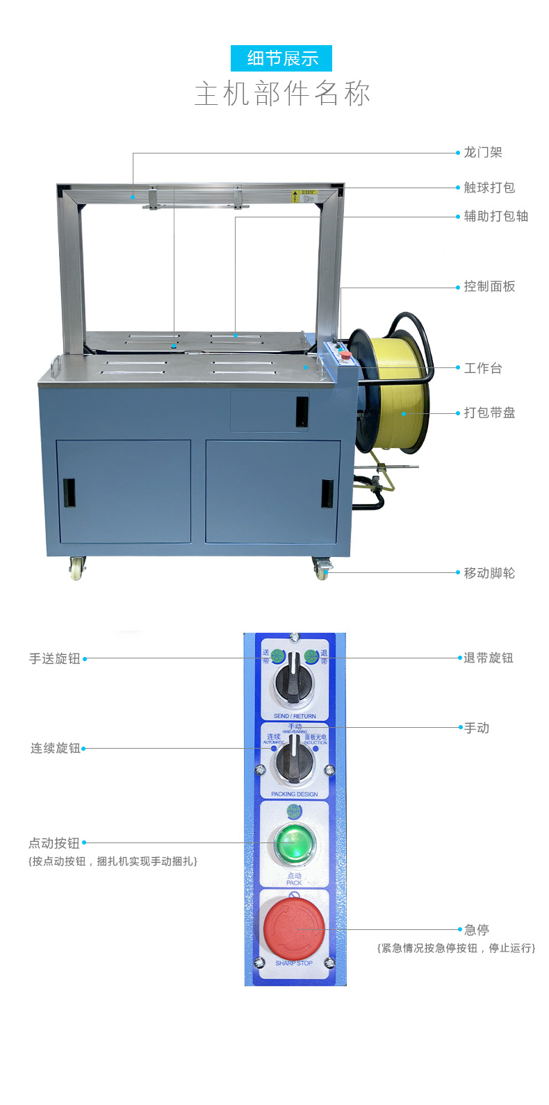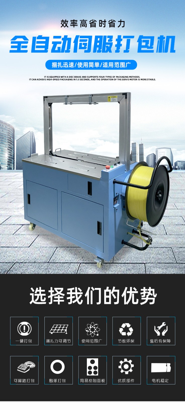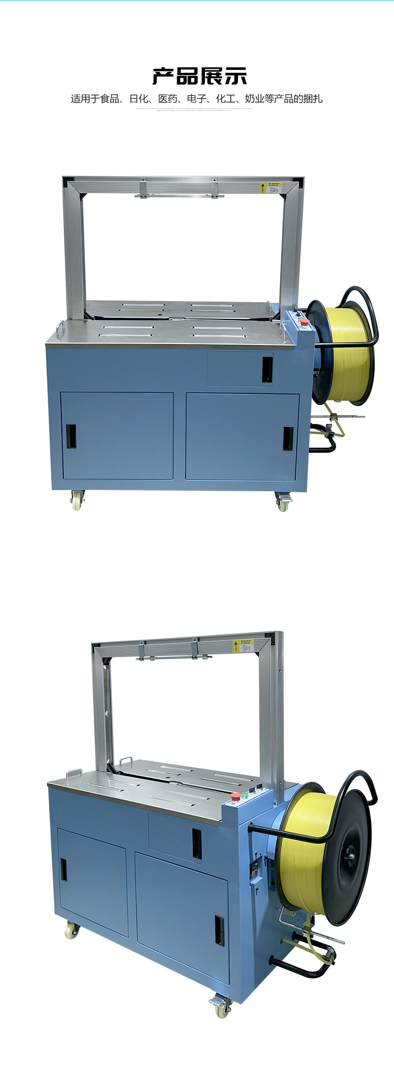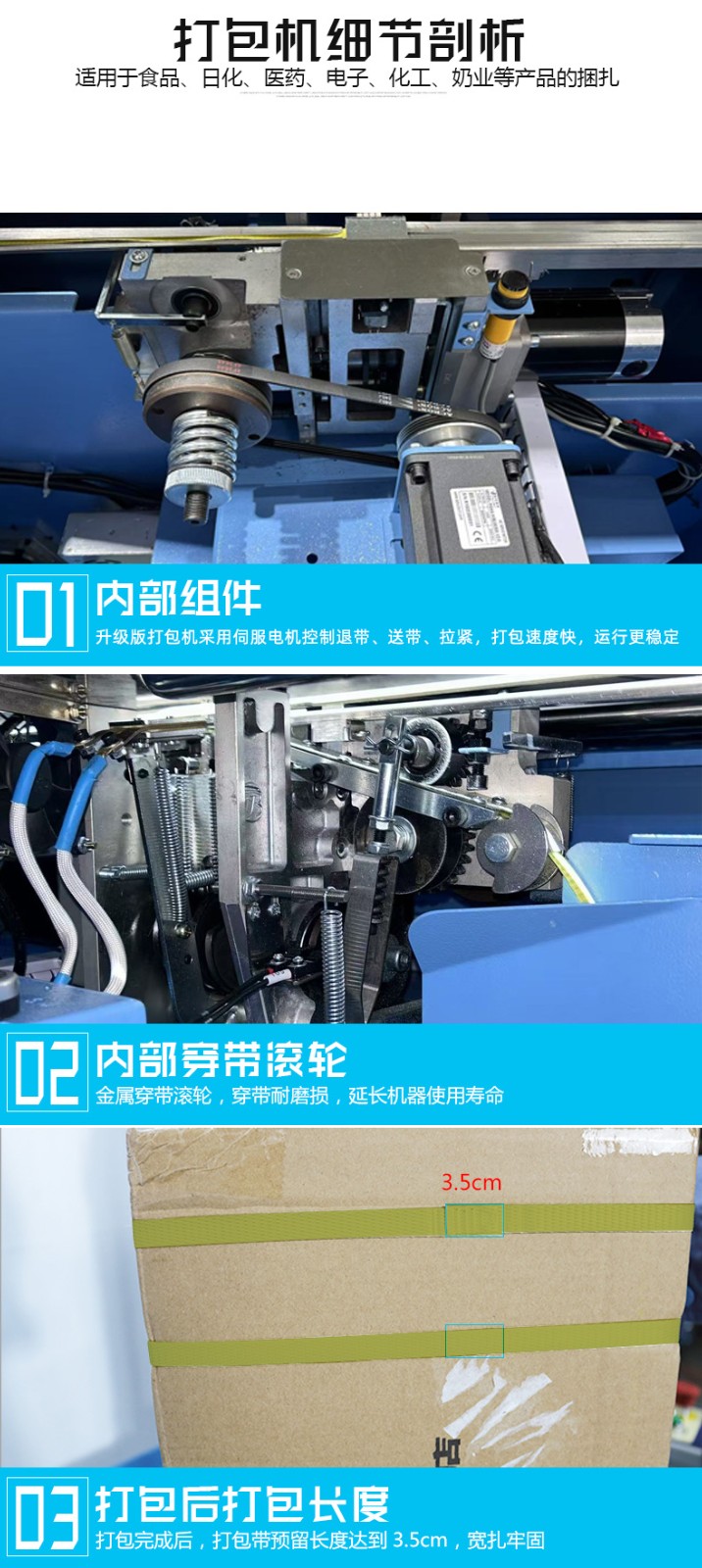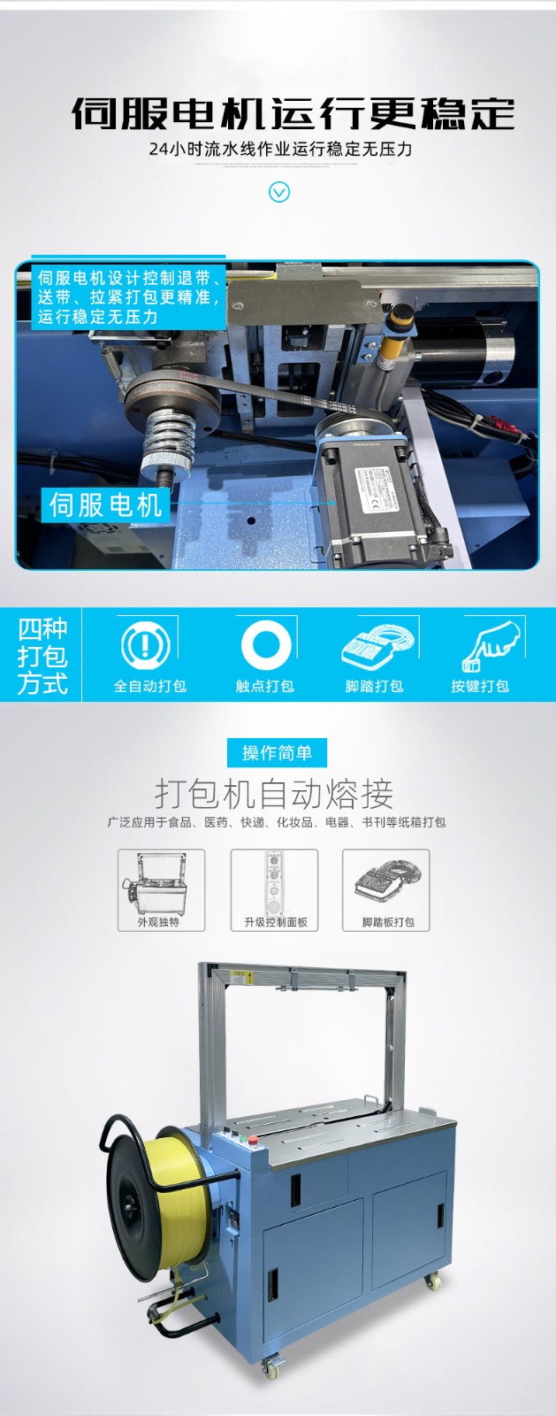 - 全自動伺服打包機(jī)通常具有簡潔、緊湊的外觀設(shè)計(jì),整體結(jié)構(gòu)堅(jiān)固耐用。其機(jī)身主要由框架、工作臺、輸送帶、控制箱等部分組成。框架一般采用優(yōu)質(zhì)金屬材料制成,經(jīng)過精細(xì)加工和表面處理,具有良好的穩(wěn)定性和耐腐蝕性。工作臺位于機(jī)器的中央位置,是放置待打包物品的區(qū)域,表面平整光滑,便于物品的放置和移動。輸送帶貫穿整個機(jī)器,用于輸送物品進(jìn)出打包區(qū)域,其寬度和長度根據(jù)不同的機(jī)型有所差異,以適應(yīng)各種尺寸的物品打包。控制箱通常安裝在機(jī)器的一側(cè),集成了操作面板和控制系統(tǒng),方便操作人員進(jìn)行參數(shù)設(shè)置和對機(jī)器的運(yùn)行進(jìn)行監(jiān)控。