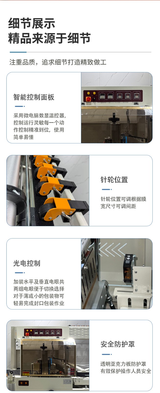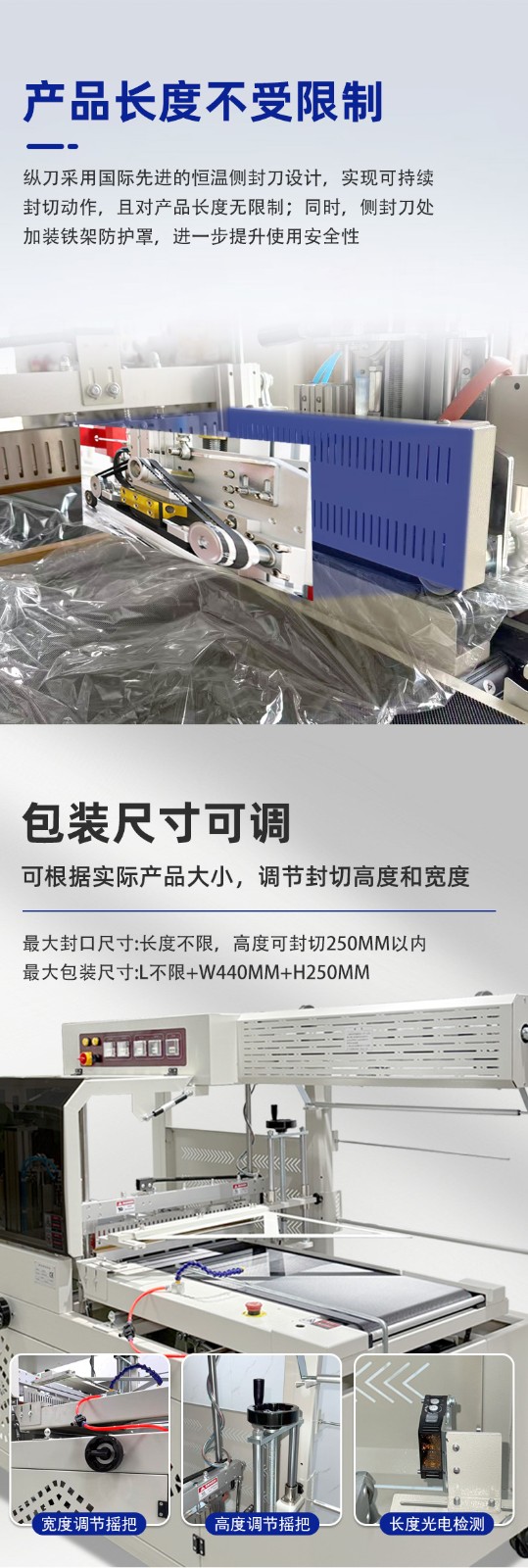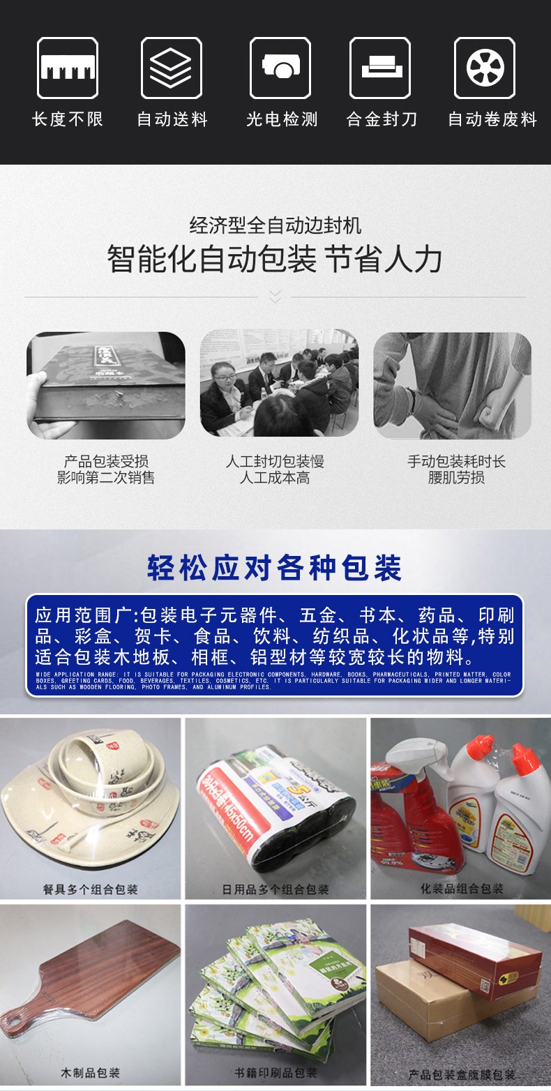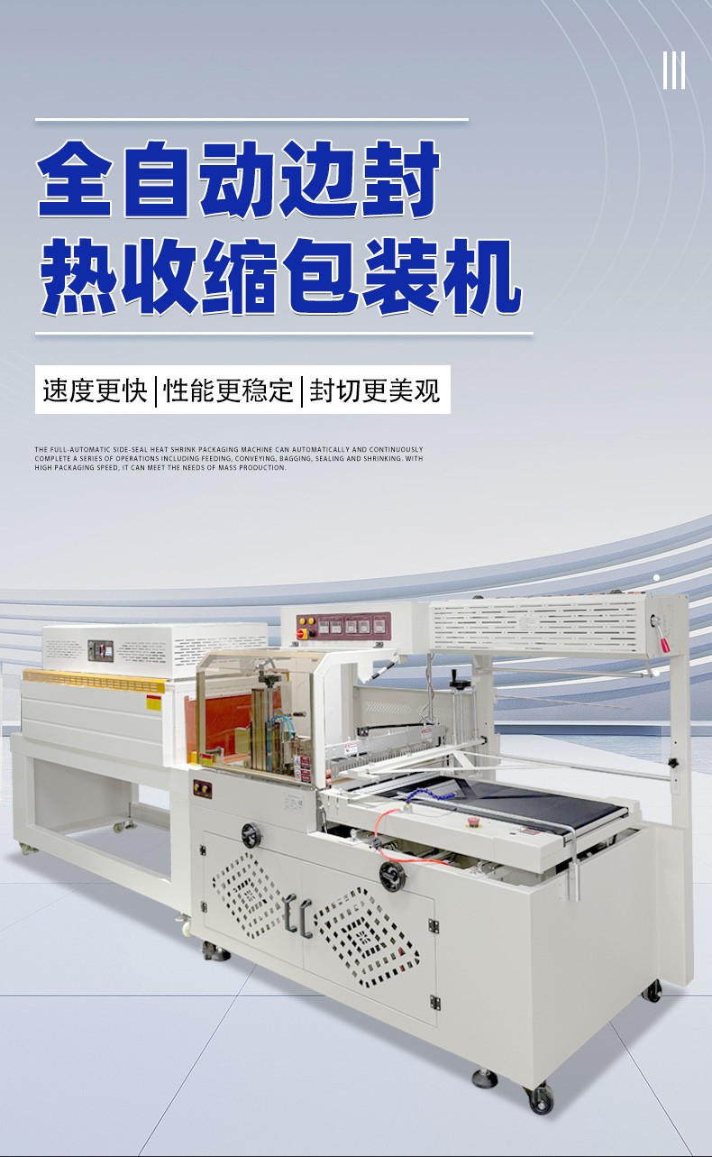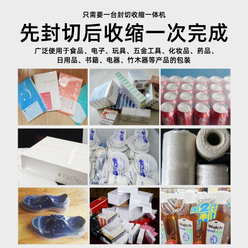 - 適用范圍廣4:邊封設(shè)計(jì)的包裝機(jī)可包裝長度不限的產(chǎn)品,通過調(diào)整還能適應(yīng)不同寬度、高度的產(chǎn)品包裝,可用于 POF、PVC 等多種熱收縮膜,能滿足食品、電子、醫(yī)藥、日化等多個(gè)行業(yè)的包裝需求。